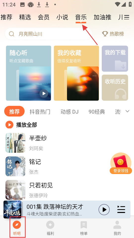 1、音樂頁具搜索與熱歌榜,含隨心聽等板塊,推薦半壺紗等歌曲,可便捷播放滿足音樂收聽需求。