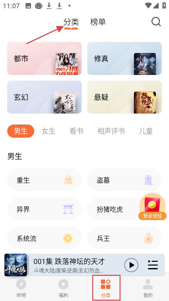 3、分類頁面涵蓋都市、修真等題材分區,設男生、女生專區,方便用戶按題材查找有聲內容定位心儀作品。