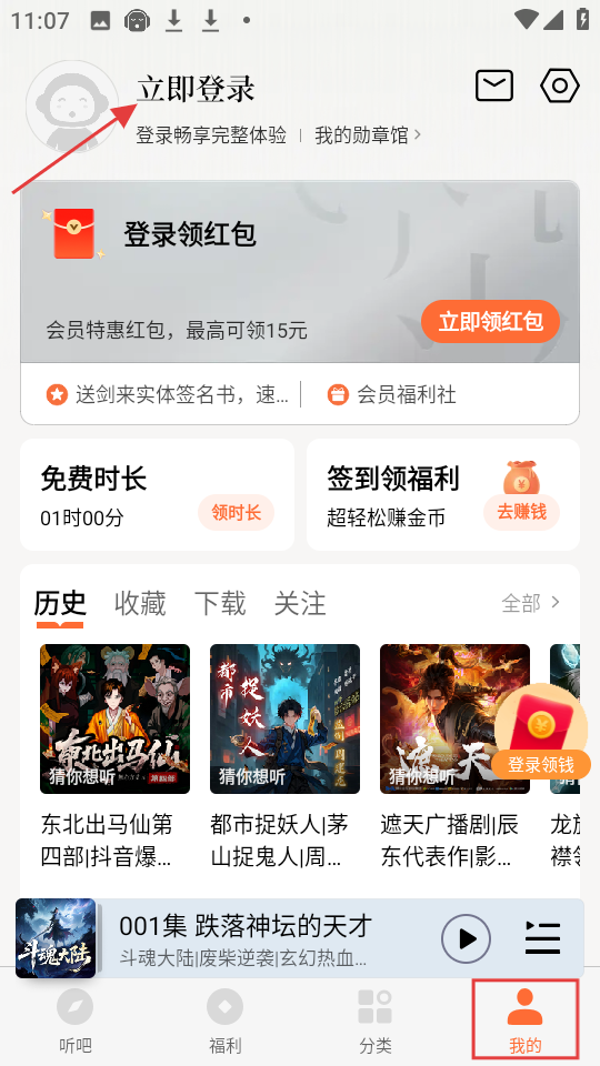4、我的頁面有登錄及領紅包入口,顯示免費時長、簽到福利,呈現歷史、收藏記錄,便于管理個人聽書聽歌數據。