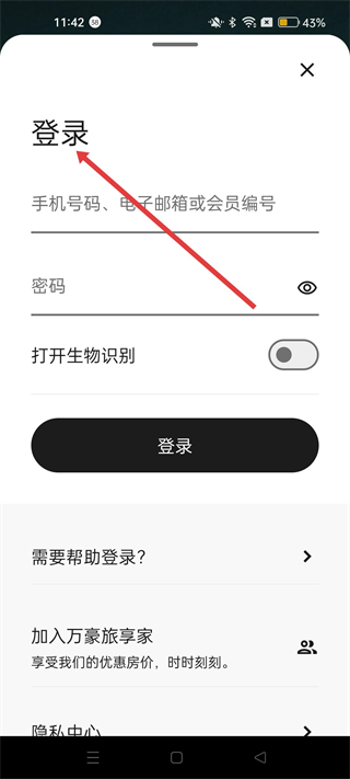 2、登錄時,輸入手機號碼、電子郵箱或會員編號及密碼,可選擇打開生物識別功能,點擊登錄進入賬戶。