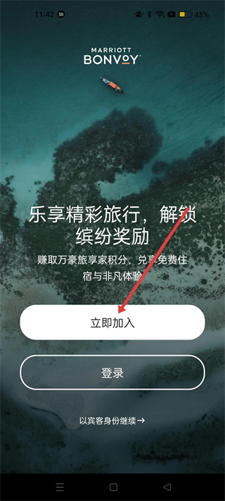 1、可選擇立即加入萬豪旅享家,賺取積分兌換免費住宿與體驗,也可直接登錄,或以賓客身份繼續使用部分功能。