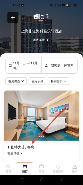 4、選擇具體酒店后,可查看酒店詳情,選擇客房類型,使用積分或特別房價預訂,了解客房詳情后完成預訂操作。