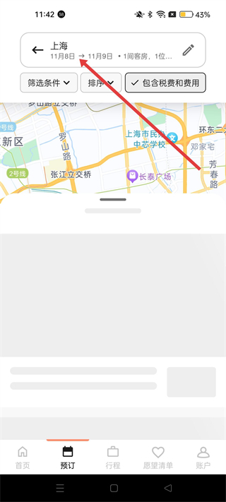3、進入預訂板塊,可選擇城市、入住和退房日期、客房數量及賓客人數,設置篩選條件和排序方式,查看包含稅費和費用的酒店信息。