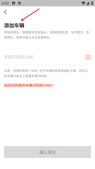 1、添加車輛頁面,需填車輛識別碼,VIN可在前擋風玻璃右下角或行駛證查看,添加后能管理車輛相關信息。
