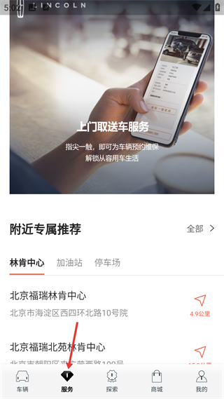 2、服務頁面,展示上門取送車服務,還推薦附近林肯中心等地點,方便車主找到周邊配套服務。