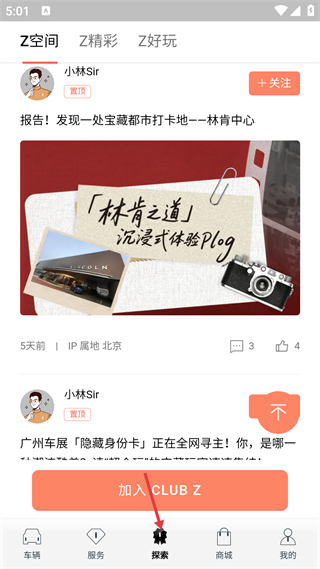 3、探索頁面,有車主分享的打卡內容與活動資訊,還有加入車主社群的入口,豐富車主互動體驗。