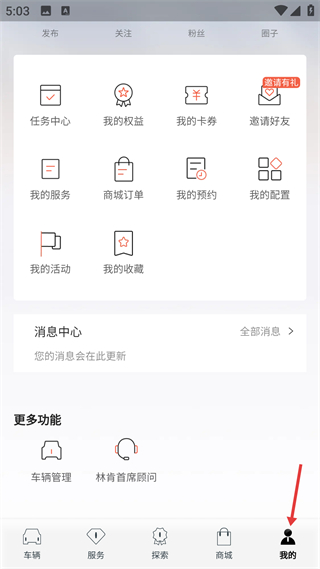 4、個人中心頁面,含任務權益卡券等功能,還有消息中心與更多服務入口,便于車主管理個人相關事項。