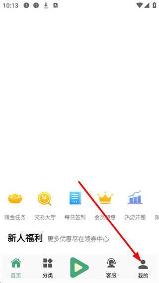 1、進入我的界面,可看到賺金任務、交易大廳等功能入口,還有新人福利提示,方便用戶了解平臺功能與優惠活動。