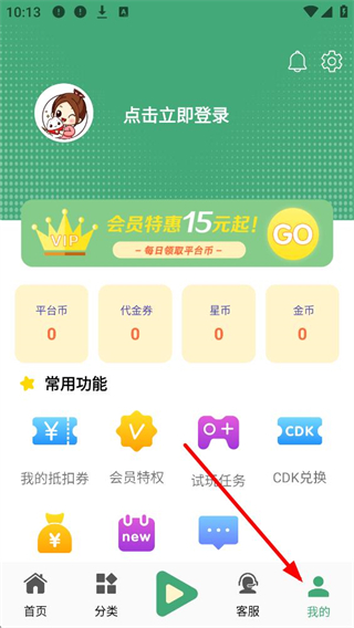 2、我的登錄界面,點擊立即登錄后可查看平臺幣、代金券等資產,使用我的抵扣券、會員特權等常用功能,享受會員特惠等服務。