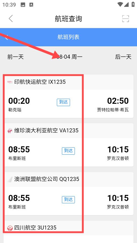 3、航班查詢結果頁顯示08月4日周一的航班列表,含印航快運航空等航班,標注起降時間與城市,清晰呈現航班信息,方便旅客參考。