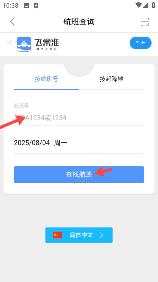 2、進入航班查詢頁有按航班號按起降地選項,輸入航班號及日期后可點擊查找航班,頁面簡潔,助力旅客查詢航班動態。