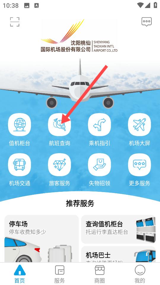 1、首頁展示沈陽桃仙機場服務有機值機柜臺航班查詢等功能圖標,推薦服務含停車場等內容,方便旅客獲取機場相關服務。
