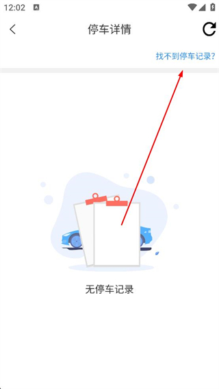 2、在停車詳情頁,若顯示無停車記錄,點擊右上角找不到停車記錄選項,查看相關提示內容。