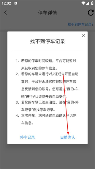 3、在找不到停車記錄彈窗中,閱讀提示信息后,點擊自動確認按鈕,進入自助確認的信息填寫頁面。