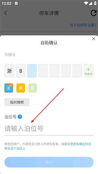 4、在自助確認頁面,填寫車牌號選擇車牌顏色,輸入對應的泊位號,確認信息準確后點擊確定按鈕,完成停車信息的自助登記。