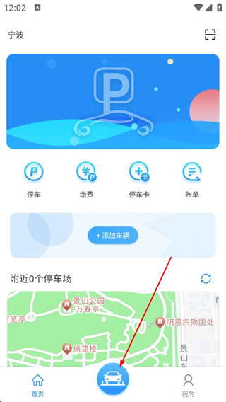 1、進入寧波停車軟件首頁,確認當前城市為寧波,點擊底部車輛,進入停車詳情頁面,查看是否有已存在的停車記錄。