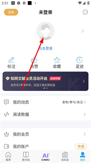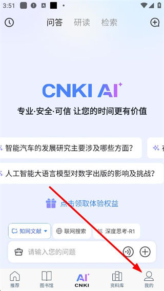 1、進入CNKI界面,可看到智能問題推薦等內容,點擊底部我的選項,即可進入對應的個人相關頁面,開啟后續操作。