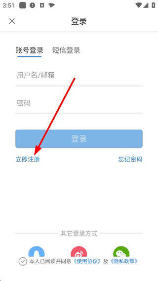 3、進入登錄界面,看到賬號登錄與短信登錄選項,點擊立即注冊,即可進入手機號注冊的信息填寫頁面。
