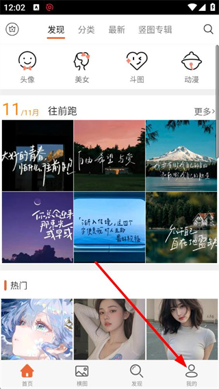 1、進入安卓壁紙的發現頁面,可見頭像美女等分類,還有往前跑主題內容,點擊底部我的按鈕,即可進入對應的個人頁面。