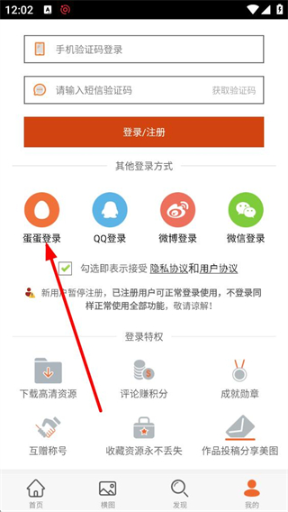 2、進入我的頁面后進入登錄界面,支持手機驗證碼登錄,還有蛋蛋QQ等其他登錄方式,同時展示了登錄可享的特權。