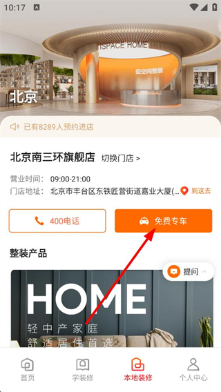 4、切換到本地裝修頁面,能看到北京門店的營業時間地址等信息,還有400電話和免費專車按鈕,可查看門店相關服務。