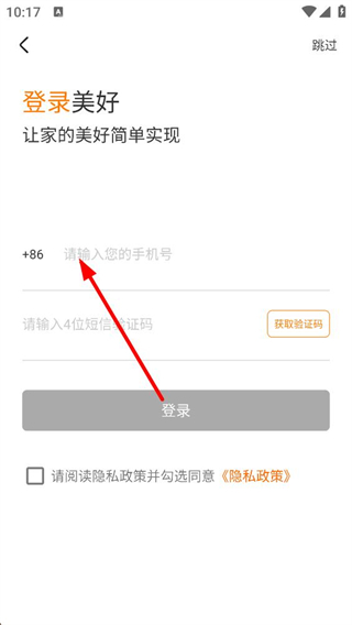3、進入登錄界面,看到登錄美好提示,需輸入手機號獲取并填寫4位驗證碼,還需勾選隱私政策,完成后可進行登錄操作。