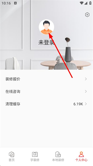 2、進入個人中心頁面,顯示未登錄狀態,還有裝修報價在線咨詢清理緩存等選項,點擊未登錄區域,進入登錄操作界面。