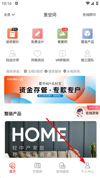 1、進入愛空間首頁,能看到裝修報價免費設計等裝修相關功能,底部有首頁學裝修本地裝修個人中心選項,點擊個人中心進入對應頁面。