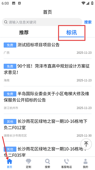 2、首頁設搜索框查招標信息,標訊板塊展各類公告,含不同地區項目,可瀏覽免費及其他類型的招標內容。