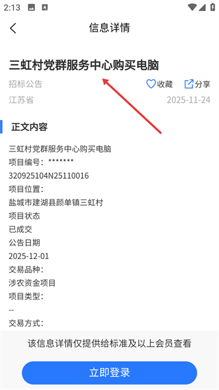 3、信息詳情頁展公告標題、地區與時間,正文呈項目編號等基礎信息,部分內容需會員查看,支持收藏分享。
