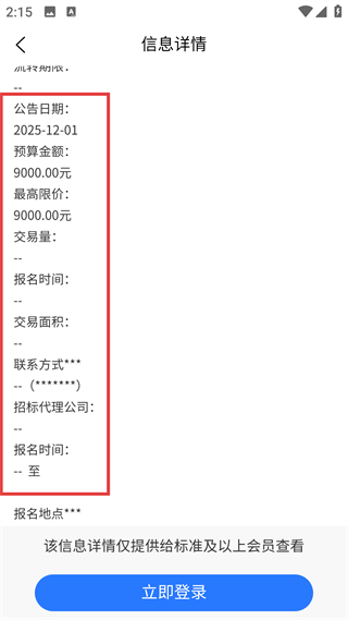4、詳情頁補展預算金額等數據,還有聯系方式等信息,這些內容僅對標準及以上會員開放,需登錄查看。