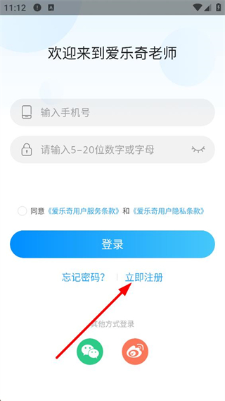 1、進入愛樂奇老師的登錄頁面,需輸入手機號和密碼,也可選擇微信、微博等第三方方式登錄,勾選相關條款后點擊登錄,還能選擇立即注冊或忘記密碼。