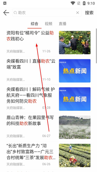 2、在主界面搜索助農相關內容,進入綜合結果頁面,選擇資陽有位橘司令公益助農踐初心,點擊進入詳情頁。