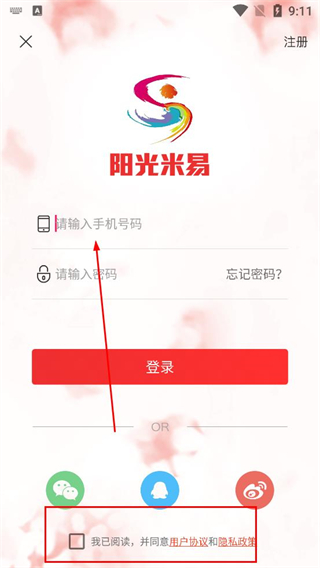 1、打開軟件進入登錄頁面,填寫手機號碼和密碼,勾選協議后點擊登錄按鈕,完成賬號登錄。