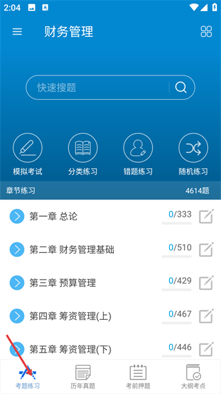 1、進入考題練習界面,可使用模擬考試等功能,也能按章節練習題目,各章節題量清晰展示,方便規劃財務管理知識點練習。
