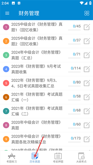 2、切換至歷年真題板塊,可見不同年份的財務管理考試真題,每套真題標注題量,便于按需選擇對應年份的練習內容。