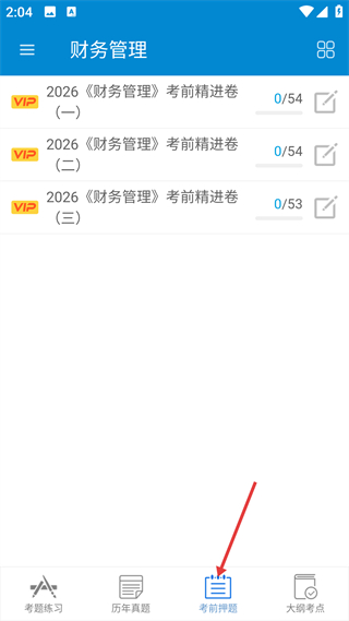 3、進入考前押題板塊,能看到標有VIP標識的考前精進卷,每套卷題量明確,助力考生針對財務管理考點進行考前沖刺。
