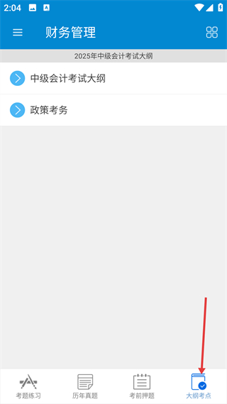 4、點擊大綱考點板塊,可查看中級會計考試大綱與政策考務,明確財務管理考試范圍與要求,為備考提供官方參考。