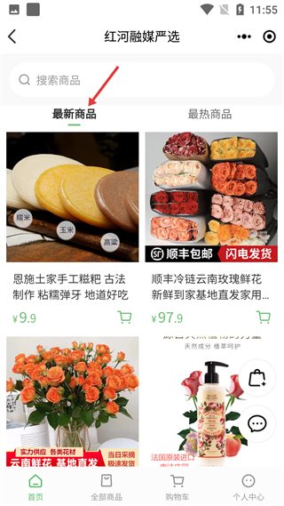 2、紅河融媒嚴選,有搜索商品功能,分最新和最熱商品分類,展示恩施糍粑、云南玫瑰鮮花等,用戶可瀏覽選購。