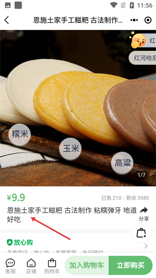 3、恩施土家手工糍粑詳情頁,有糯米、玉米、高粱等種類,古法制作,售價9.9元,已售210件,用戶可加購或立即購買。