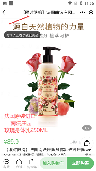 4、法國南法莊園身體乳詳情頁,限時限購,法國原裝進口,源自天然植物,售價89.9元,用戶可了解特點并購買。