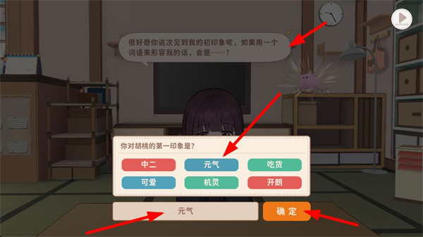1、角色會詢問對她的第一印象,界面呈現中二元氣吃貨等選項,選擇對應選項后點擊確定,推進測試流程。