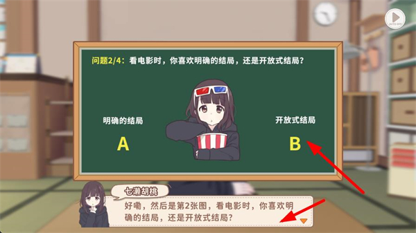 3、詢問看電影偏好的結局類型,界面呈現明確的結局和開放式結局兩個選項,選擇后繼續測試。