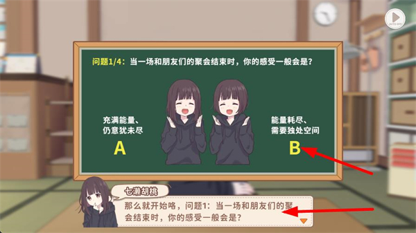 2、測試正式開始,詢問聚會結束后的感受,界面有充滿能量仍意猶未盡和能量耗盡需要獨處空間兩個選項供選擇。