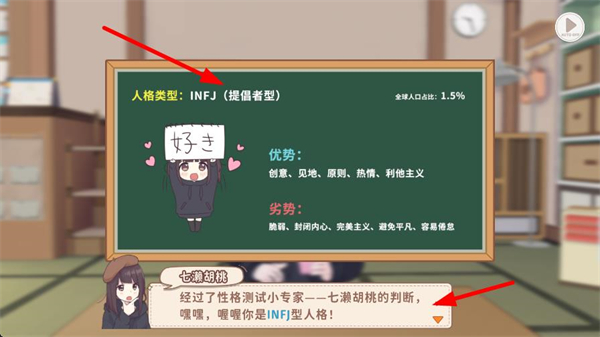 4、完成所有測試題后,界面會顯示人格類型及對應的優勢劣勢,同時角色會給出判斷結果,告知測試得出的人格類型。
