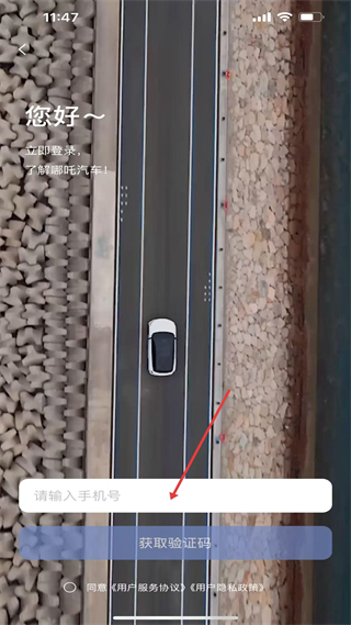 1、進入應用先看到登錄界面,提示您好并引導立即登錄了解哪吒汽車,需輸入手機號再獲取驗證碼,同時要勾選同意相關服務協議與隱私政策。