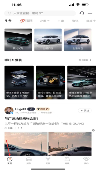 2、登錄后進入發現頁面,頂部有搜索欄,設預約試駕全國門店等功能按鈕,展示哪吒S獵裝內容,還有用戶發布的互動動態信息。