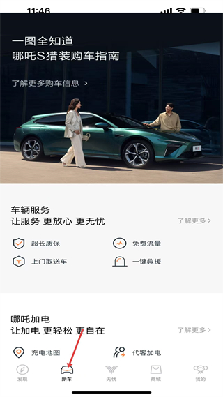 3、點擊新車進入對應頁面,含哪吒S獵裝購車指南,車輛服務板塊有超長質保等服務,哪吒加電板塊提供充電相關配套功能。