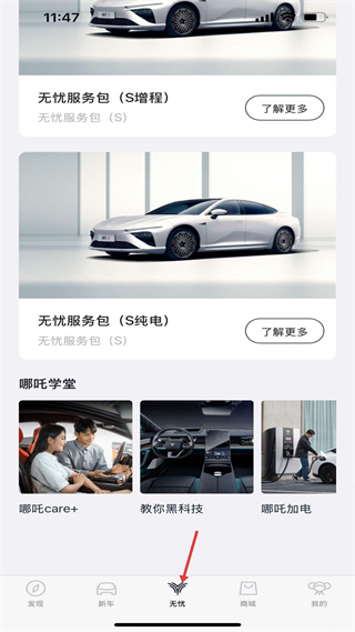 4、選擇無憂進入對應頁面,展示無憂服務包信息,還有哪吒學堂板塊,涵蓋哪吒care+教你黑科技哪吒加電等實用內容。