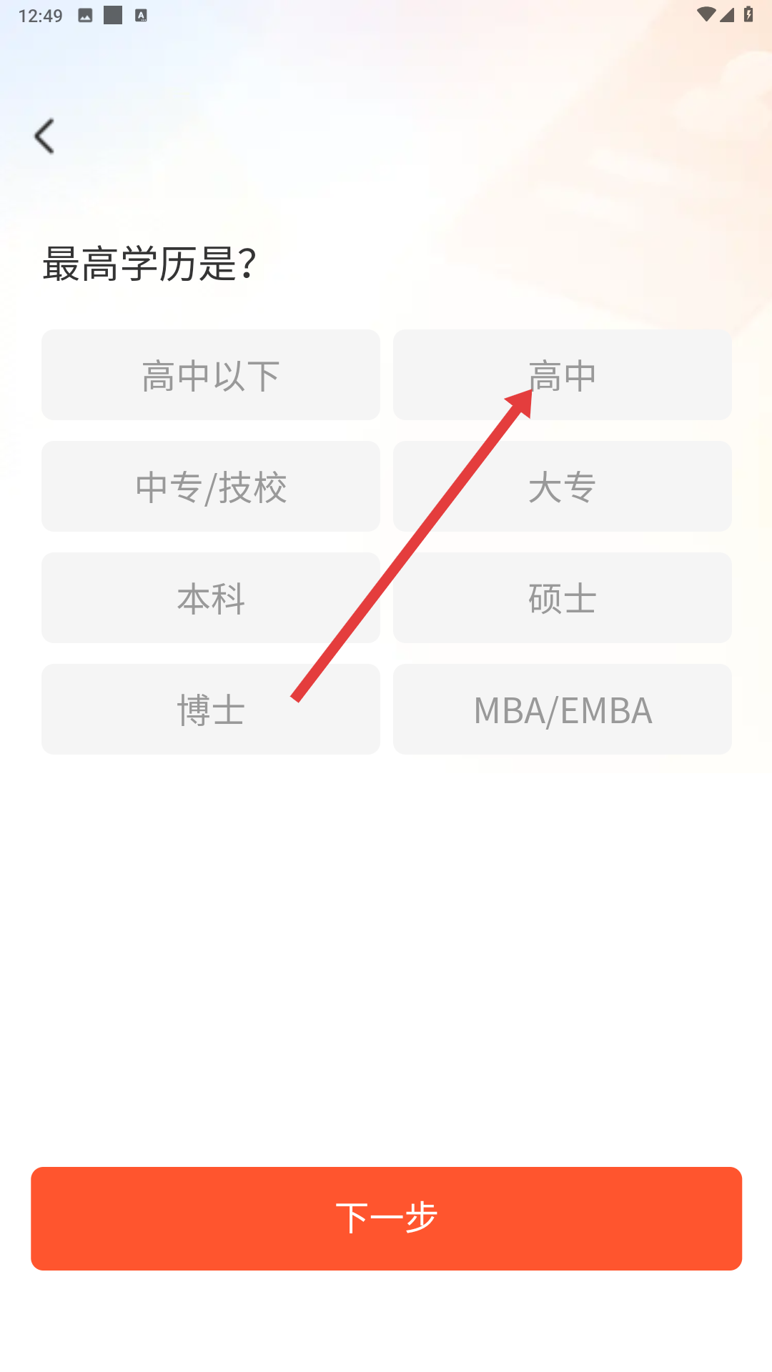 4、接著選擇最高學歷,如高中,點擊下一步,完成信息填寫后即可查看相關職位信息。